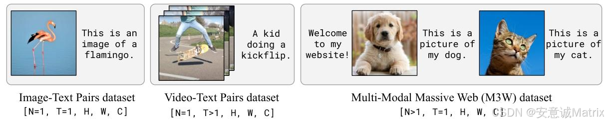 Flamingo训练数据均来自网页自动抓取,无人工标注,分为三类,覆盖"interleaved(交织)图文""单图图文对""单视频文本对"三种形态,确保数据多样性与多模态交互的真实性: