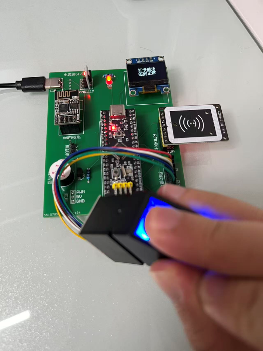 用已录入的指纹去刷指纹,能够成功签到并在OLED屏显示打卡成功,如下: