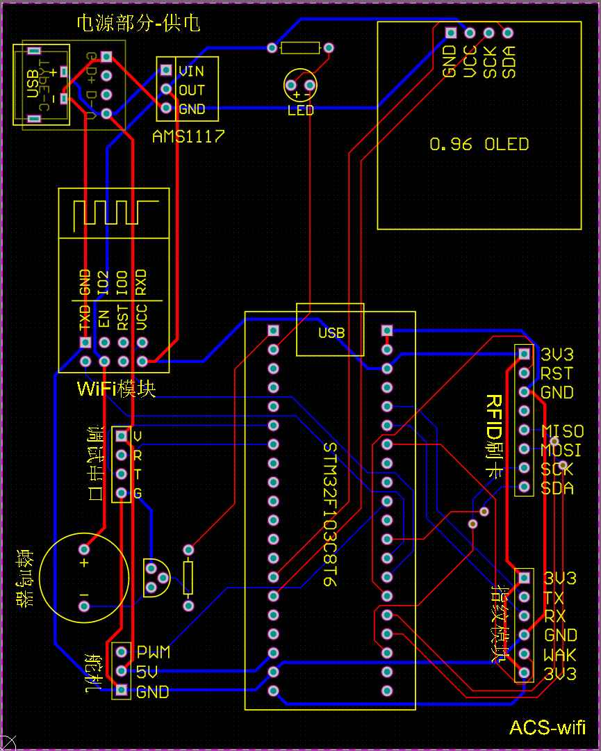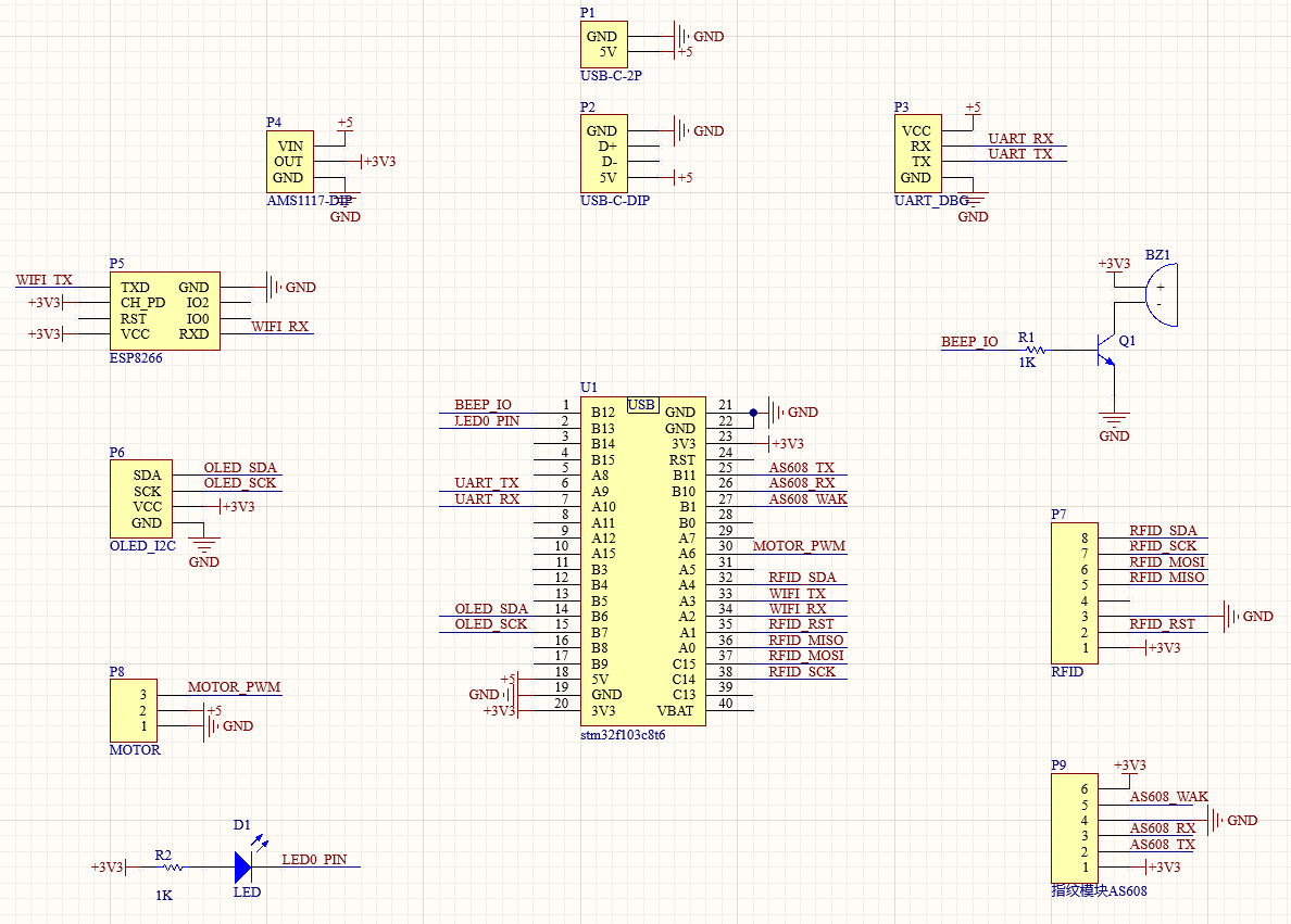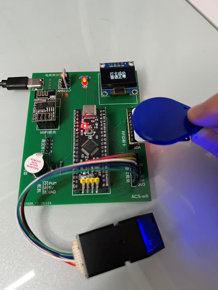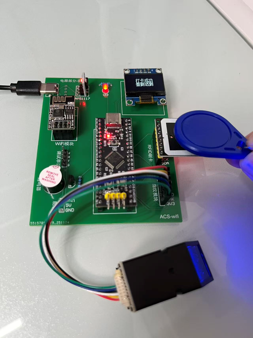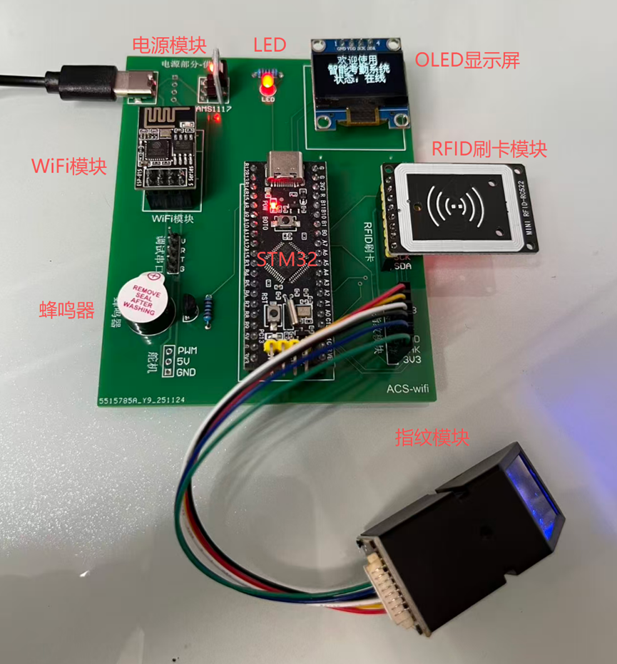 **硬件组成:**STM32单片机、RC522刷卡、AS608指纹、OLED显示、ESP8266 WiFi、蜂鸣器、LED等。