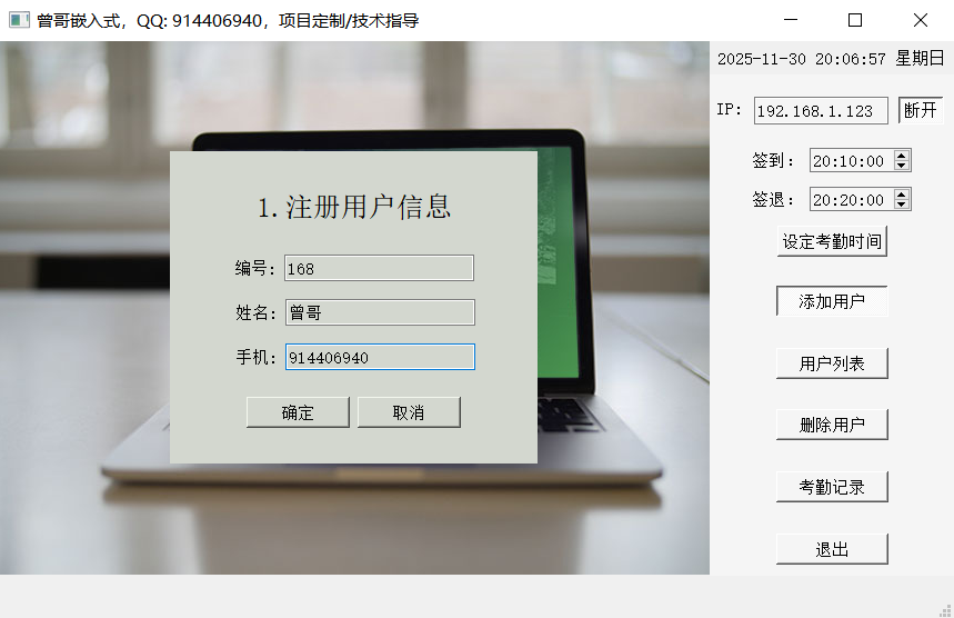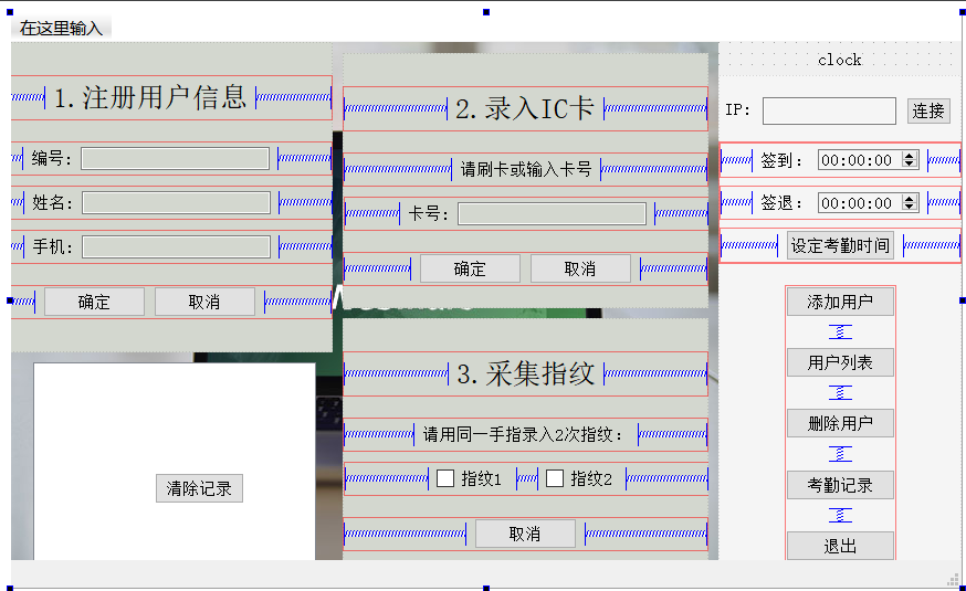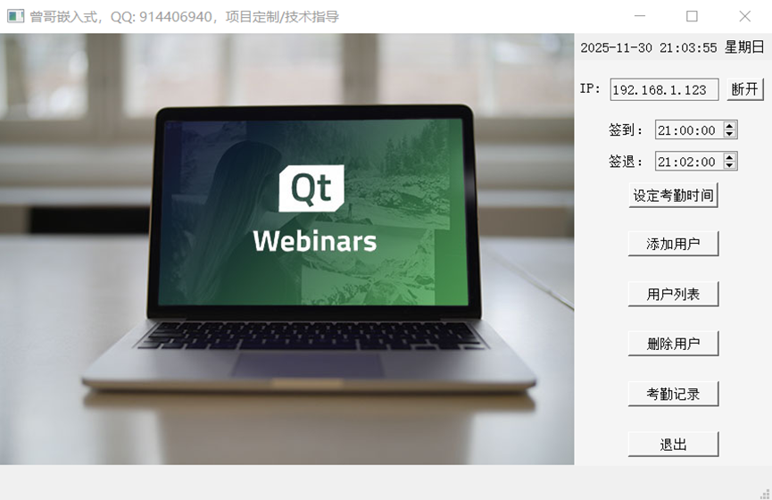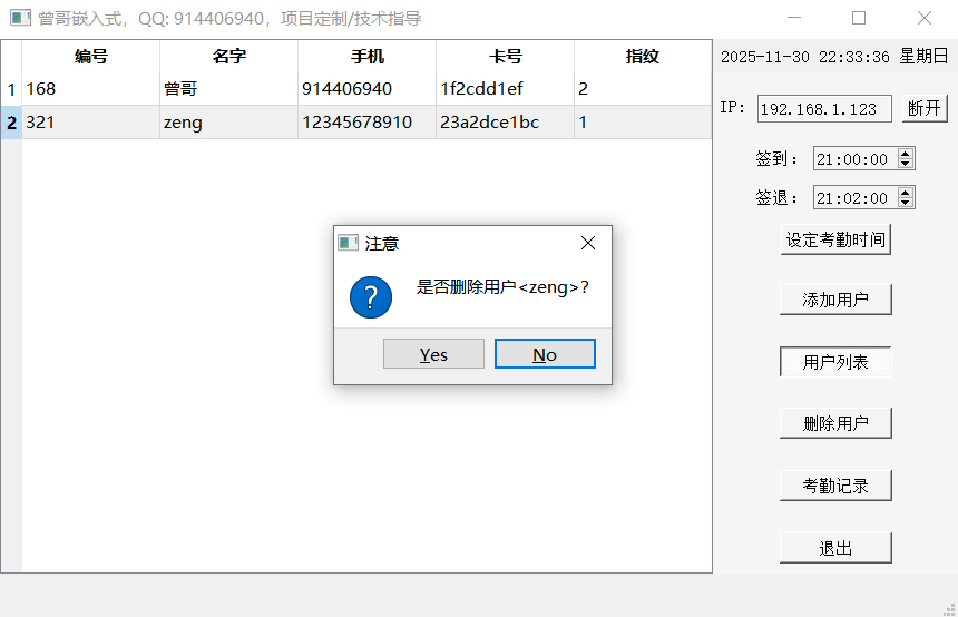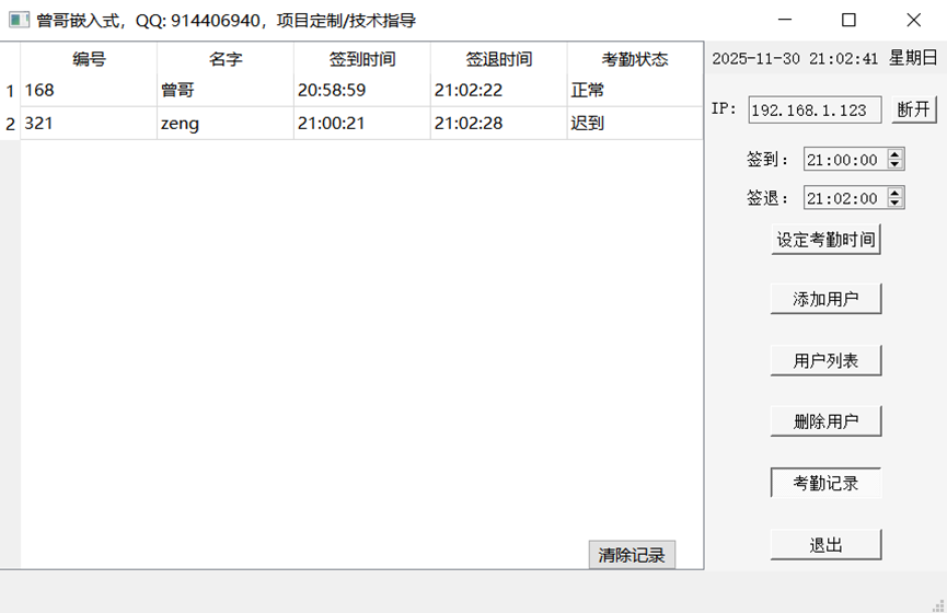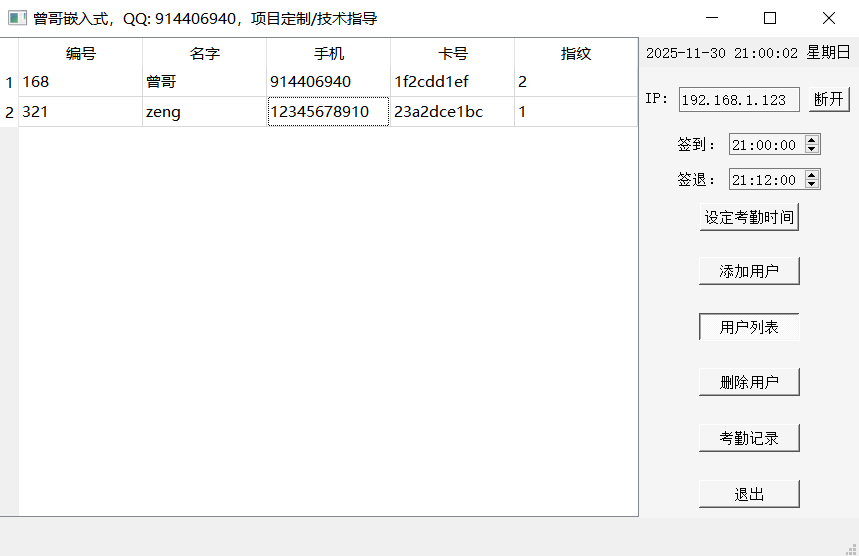 **主要功能:**系统登录、建立连接及通信、设置考勤时间、录入用户、查看用户、删除用户、刷卡签到、指纹签到、查看考勤记录等。