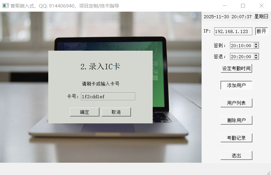 **项目概述:**由stm32和qt实现的刷卡rfid+指纹的考勤系统,管理员可在上位机:添加/删除/查看用户、设置考勤时间、查看考勤记录等,普通用户:可用指纹或刷卡来打卡考勤。