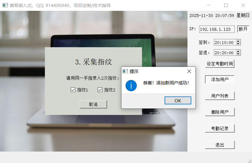 在管理员界面点击"添加用户",再输入用户信息,点击确定,然录入新卡,接着采集指纹录入(需采集2次并且一致),以上步骤无误后提示录入成功,如下: