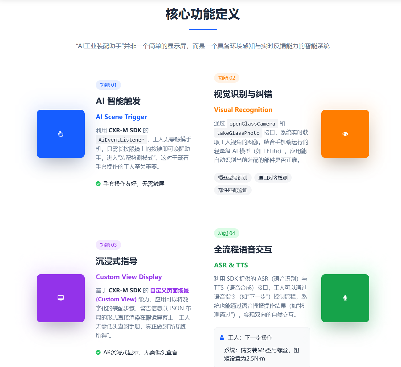 "AI工业装配助手"并非一个简单的显示屏,而是一个具备环境感知与实时反馈能力的智能系统。它利用眼镜端的摄像头作为"眼睛",手机端的算力作为"大脑",眼镜端的显示屏作为"交互界面"。