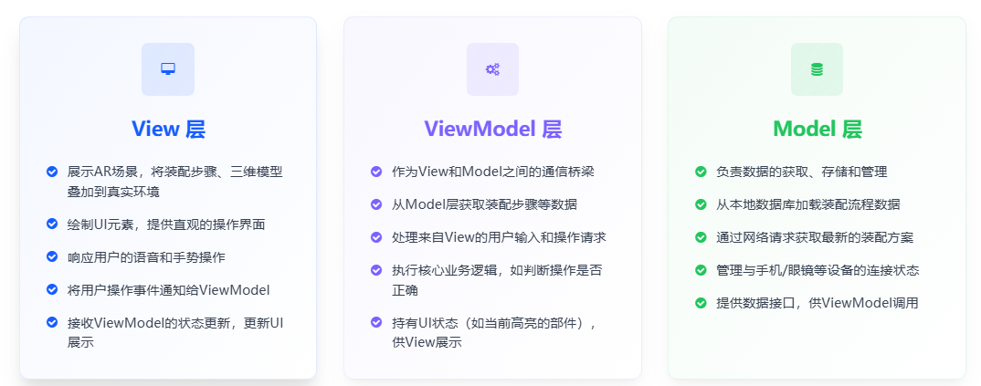 - ViewModel:作为View和Model之间的桥梁。它从Model层获取数据(如装配步骤),处理来自View的用户输入,执行核心业务逻辑(如判断操作是否正确),并持有需要展示在UI上的状态(如当前高亮的部件)。