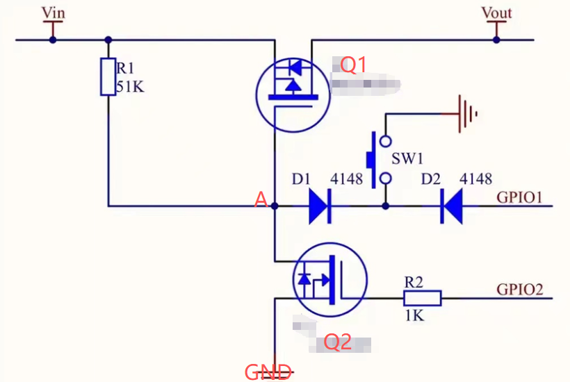Q2因为是NMOS,所以A点电压变为低电平,PMOS继续导通,后续电源供电由IO口控制打开电源。