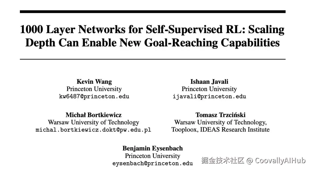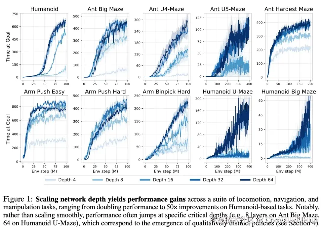 NeurIPS 2025最佳论文奖由普林斯顿大学与OpenAI的合作研究,他们成功将RL网络深度扩展至1024层,在自监督强化学习任务上实现了性能2-50倍的提升。这项研究不仅证明了深度scaling对RL的有效性,还观察到了与模型规模相关的"突现现象"------当网络达到特定深度阈值时,智能体会突然学会全新的技能和行为模式。