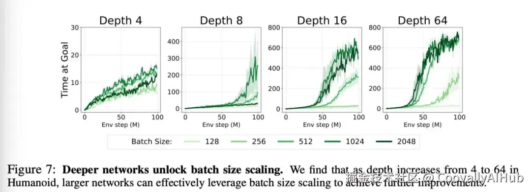 深度网络解锁批大小扩展。放大批大小在机器学习的其他领域已经得到很好的确立。然而,这种方法在强化学习(RL)中并未有效转化,先前的工作甚至报告了对基于值的RL的负面影响。确实,在我们的实验中,仅仅为原始CRL网络增加批大小仅产生边际性能差异(图7,左上角)。