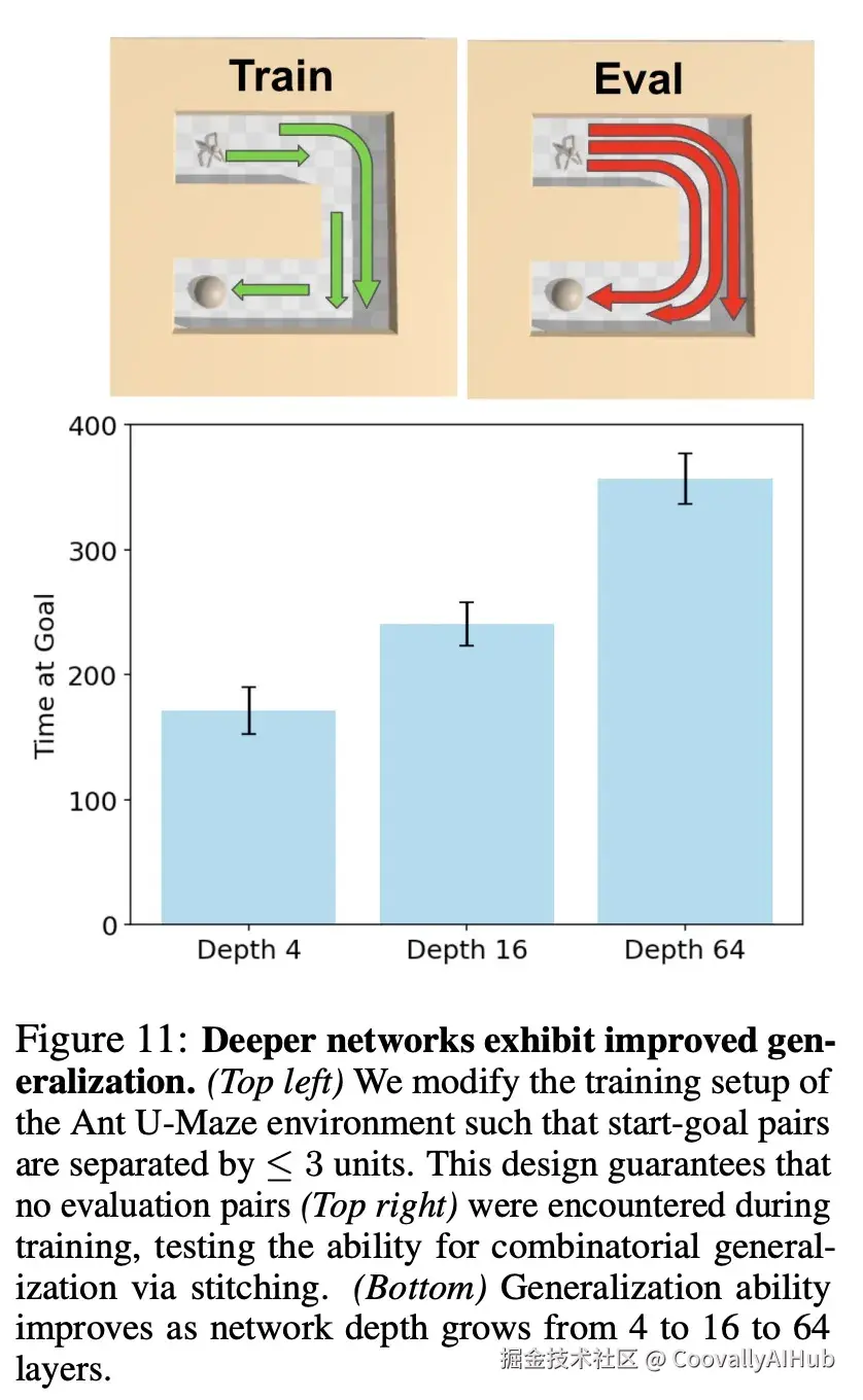 在泛化实验中,训练只使用最多3个单位距离的起始-目标对,但测试要求解决6个单位距离的任务。结果显示,深度4网络泛化能力有限,深度16网络取得中等成功,而深度64网络表现出色,表明更深网络能够将短距离经验"缝合"起来解决长距离任务。
