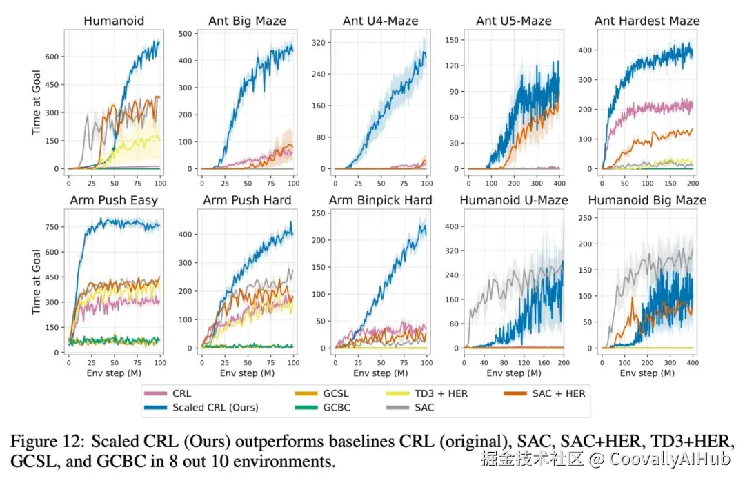 在图12中,我们展示了相同10个环境的结果,但与SAC、SAC+HER、TD3+HER、GCBC和GCSL进行了比较。扩展CRL带来了实质性的性能改进,在10个任务中的8个任务中优于所有其他基线方法。唯一的例外是SAC在Humanoid Maze环境中,早期表现出更高的样本效率;然而,扩展后的CRL最终达到了可比的性能。这些结果强调了扩展CRL算法的深度能够在目标条件强化学习中实现最先进的性能。