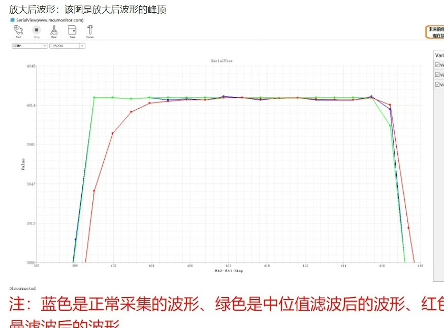 在主循环中,我们可以正常采集并输出卡尔曼滤波后的数据、中位值滤波后的数据以及原始ADC数据波形。为了方便调试和观察,可以通过串口或DAC等接口将数据输出到示波器或其他显示设备上。在程序的关键部分添加注释,有助于理解和维护程序。例如: