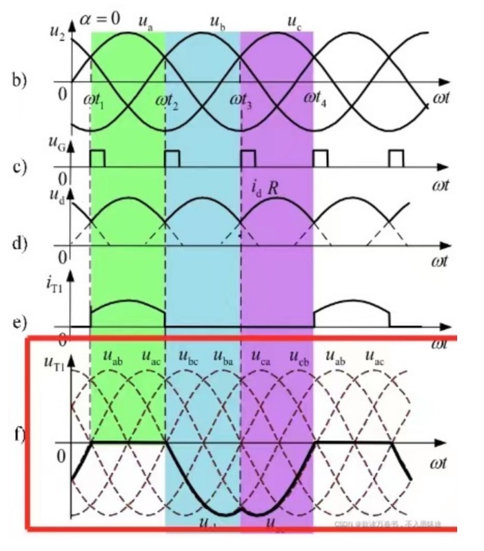 这里有个坑------触发脉冲必须和对应相的电压同步。用Phase-Locked Loop模块锁住电源相位,再用Transport Delay模块做角度延时,比直接算时间更抗干扰。