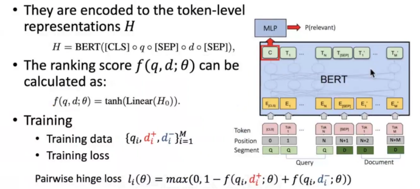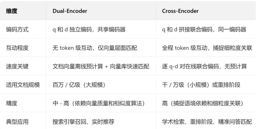 CLS\]:"分类标记",相当于这 "一句话" 的 "总结句符号",后面会用它的输出做最终判断; \[SEP\]:"分隔标记",相当于 "逗号 + 句号",明确划分 q 和 d 的边界(告诉模型 "前面是查询,后面是文档")。 2,拼接完成后的sequence会经过一个多层transformer 每一层都在做 "q 和 d 的 token 级交互" 3,将最后一层的CLS token作为q,d的共同表示 经过多层 Transformer 编码后,序列中每个 token 都会输出一个 "高维向量"(比如 768 维),代表这个 token 在 "q+d" 语境下的语义特征。 疑问:为什么选 CLS token? * \[CLS\]是序列的第一个 token,在训练时就被设计成 "整个序列的全局表示"------ 它的向量会融合 q 和 d 所有 token 的互动信息,相当于把 "q 和 d 的关联性" 浓缩成了一个 768 维的 "总结向量"; * 其他 token 的向量只代表单个词的局部特征,而 CLS token 的向量是 "全局关联特征",最适合用来判断整体相关性。 4,经过nlp投射,变成标量分数 CLS token 的 768 维向量是高维数据,无法直接作为 "分数" 使用,这一步要做 "降维 + 映射",具体操作: * 先通过一个 "全连接层(线性层)":把 768 维向量降维到 1 维(比如从 "\[0.2, 0.5, ..., 0.8\]" 变成 "1.23"); * 再通过一个激活函数(比如 Sigmoid):把 1 维数值映射到 0\~1 之间的标量分数(比如 1.23→0.85); * 最终输出:0.85 这个分数,就代表 q 和 d 的相关性(0.85 属于高相关,会排在前面)。 训练的时候:每一个query配备一个相关文档与至少一篇不相关文档 ##### 2.3.2 Dual-Encoder(双编码器) 任务:给 q 和 d 打相关性分数,但额外要求:支持百万 / 亿级文档库的快速检索。对query和document分别进行编码,形成两个独立向量,计算向量间的相似性 核心优势:q 和 d "分头做事",文档向量可提前预存  过程说明: 1,离线预计算 过程简述:所有文档d → 单独预处理(加\[CLS\]和\[SEP\]) → 共享编码器编码 → 提取d的CLS向量(vec_d) → 存入向量数据库 这一步在 "用户查询之前" 完成,只做一次(文档更新时再增量更新),核心是给每个文档 d 生成 "语义向量标签"。 (1)文档预处理:每个文档 d 单独处理,不需要和 q 拼接,仅在开头加\[CLS\](后续用它的向量代表文档) 格式为:\[CLS\] + d + \[SEP