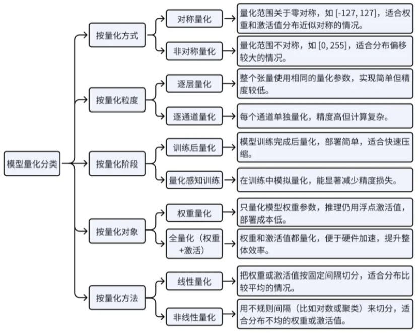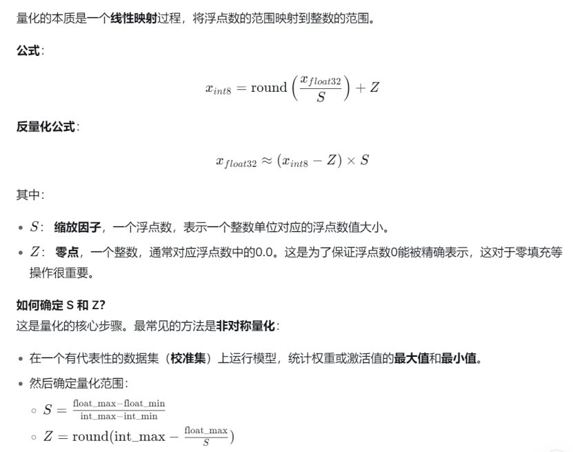 核心思想:将模型中通常使用的高精度浮点数(如32位浮点数,float32)转换为低精度整数(如8位整数,int8)来表示和计算。
