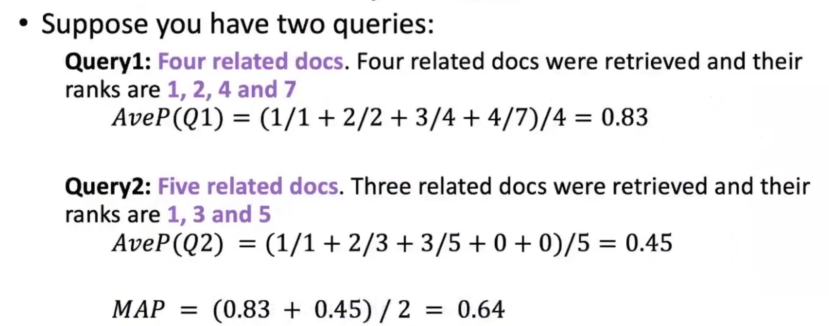数据说明:平均精确度的计算是对相应文本排列序号取倒数再乘文本位置,例如query1中,第四个相关文本,排在第七位,因此为4/7。