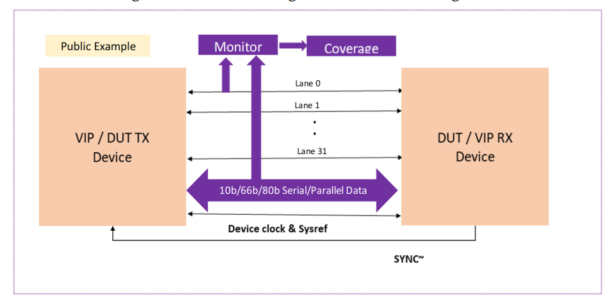 VIP可以作为TX也可以作为RX,通过lane和DUT连接,对于一些没有PHY的场景连接形式也可以为并行。