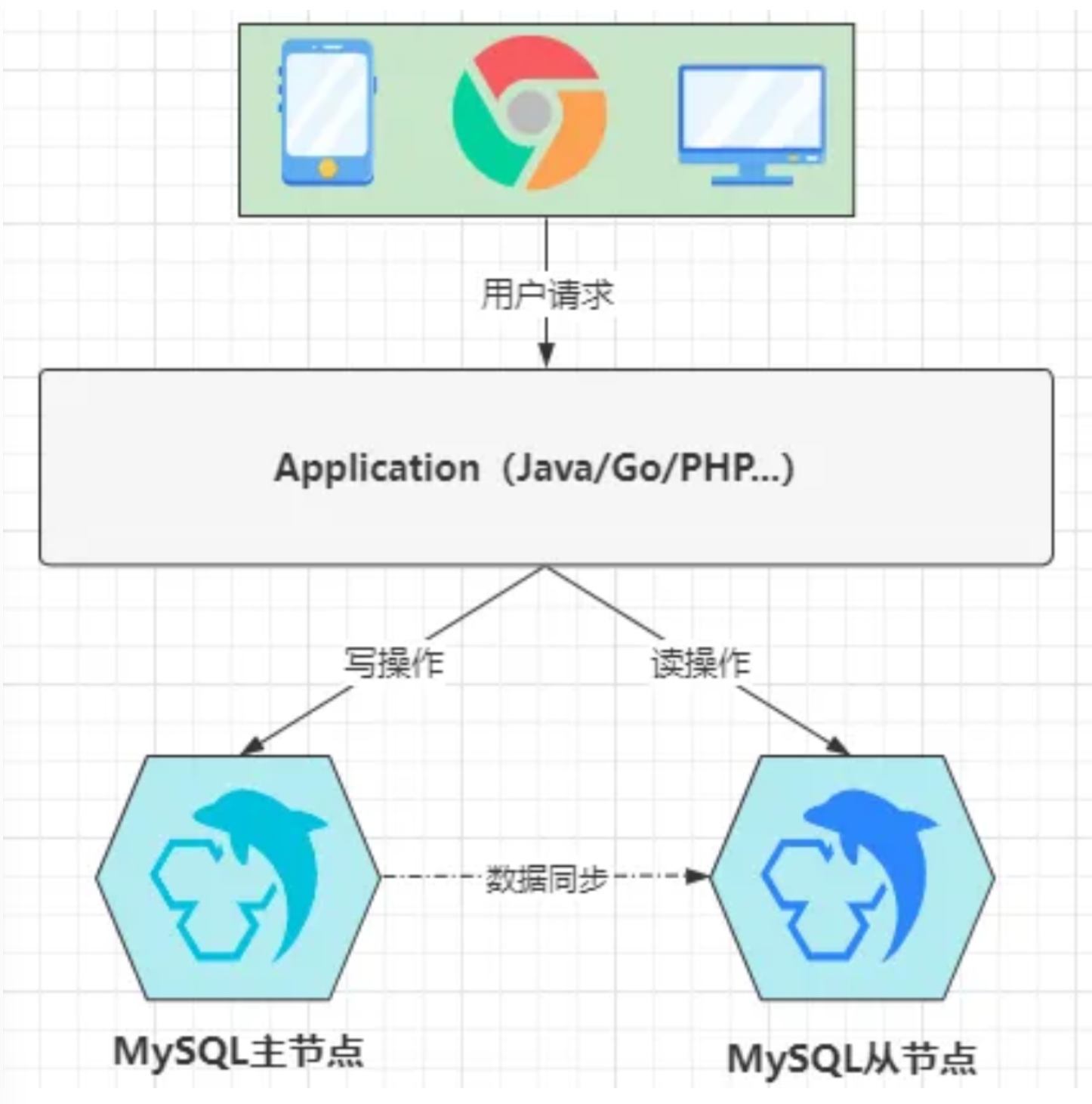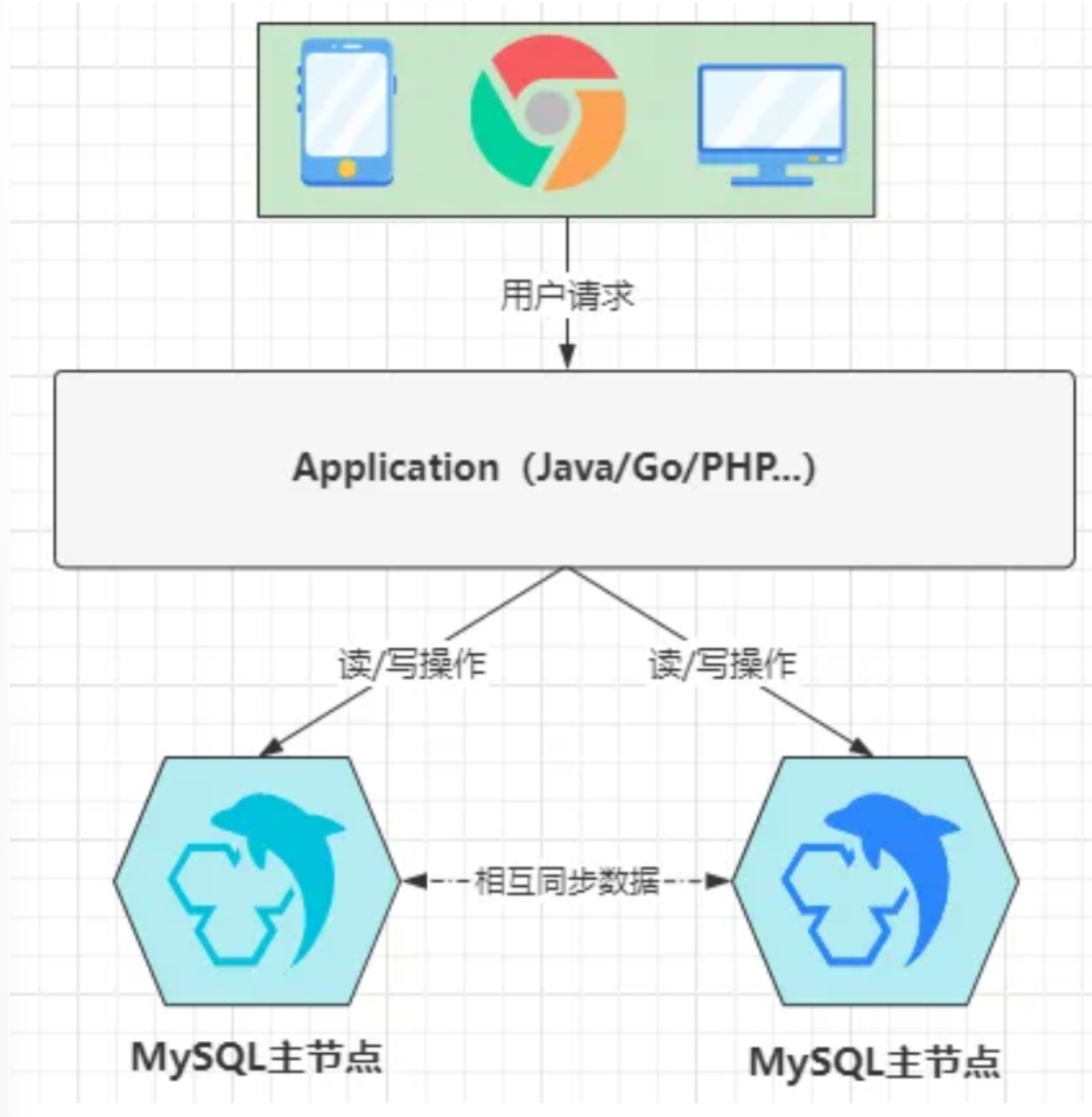 若公司项目中读写请求的比例对半开,同时整体的并发量也不算低,至少超出了单库的承载阈值,这时就可以选用双主/多主架构,结构如下: