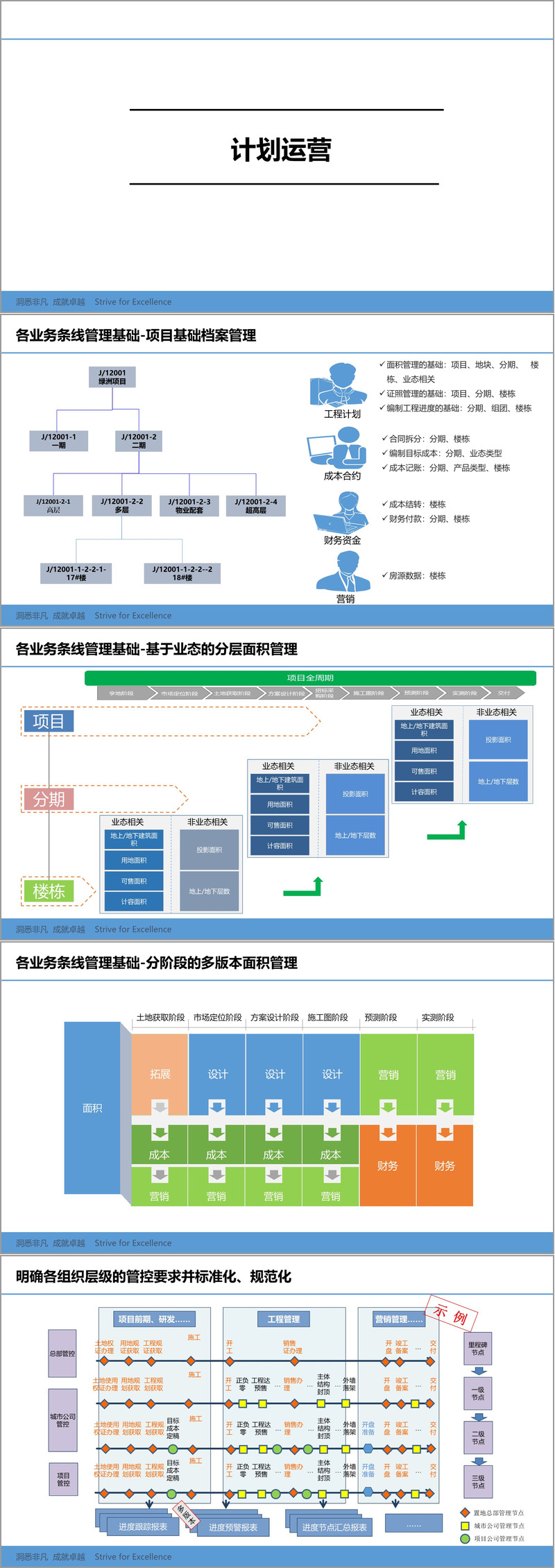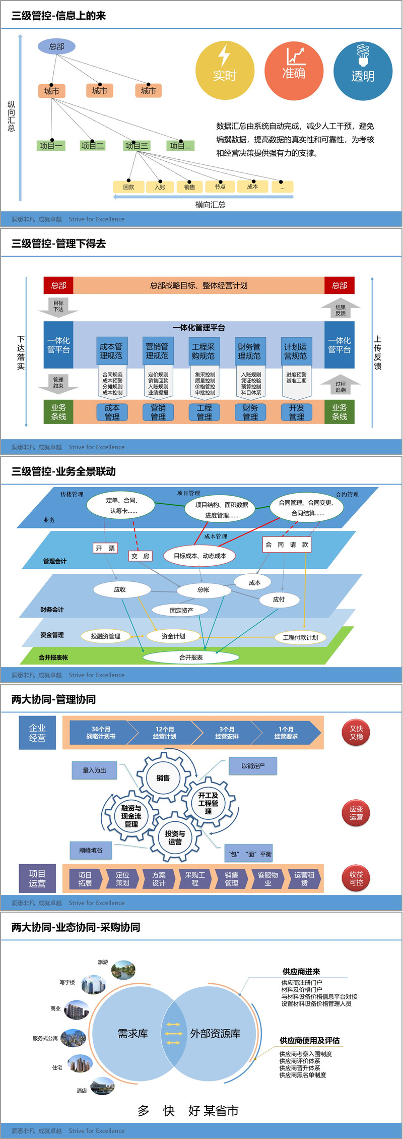所谓"三级管控",即集团总部、城市公司与项目公司之间的垂直管控体系,强调"信息上得来"、"管理下得去"和"业务全景联动"。方案建议,通过系统实现数据自动汇总,减少人工干预,强化数据的真实性与可靠性;同时,将管理制度、标准与规范通过信息化手段固化于系统中,借助预警与强控规则实现智能管控。