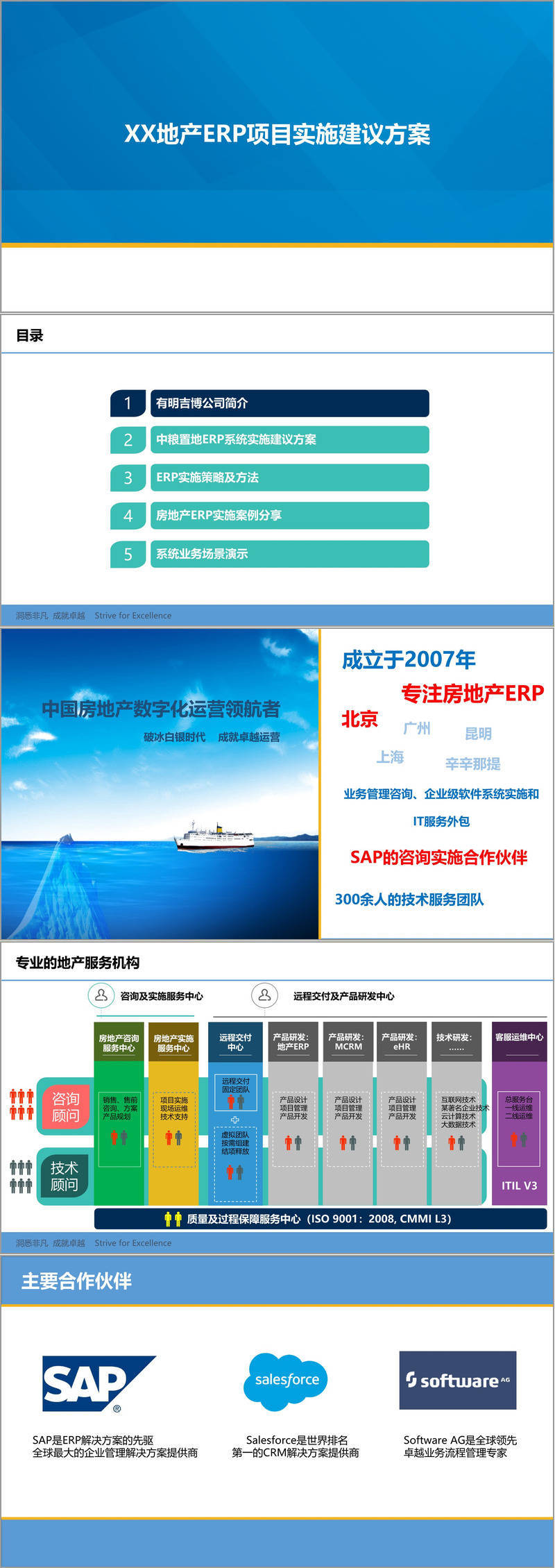 方案开篇首先介绍了有明吉博公司作为服务提供方的专业资质。该公司自2007年成立以来,始终专注于房地产ERP领域,总部设于北京,并在广州、昆明、上海乃至美国辛辛那提设有分支机构,团队规模超过300人,是SAP的咨询实施合作伙伴。公司业务覆盖业务管理咨询、系统实施与IT外包,并已自主研发包括地产ERP、MCRM、eHR等一系列产品,形成了以"咨询---实施---交付---运维"为核心的一站式服务链,质量管理体系通过ISO 9001:2008和CMMI L3认证。