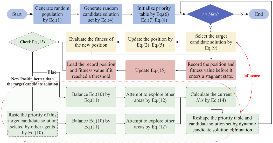 PDPSO 通过融合优先级驱动搜索与动态候选解管理,使算法能够更高效、稳定地利用更多参考信息,从而将计算资源更有效地转化为优化能力。蓝色为原始 PSO 框架,黄色表示优先级驱动搜索,红色表示状态回退机制,绿色表示除回退外的动态候选解管理部分。