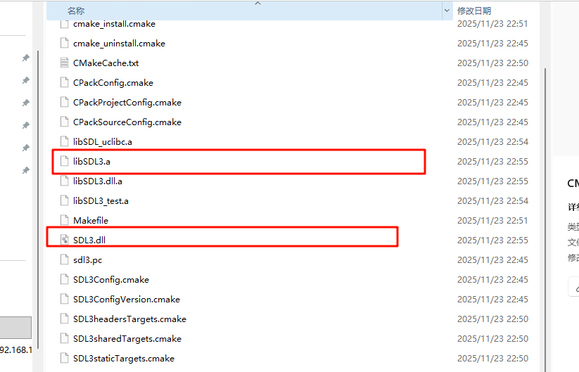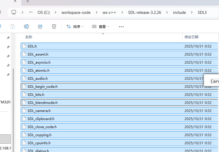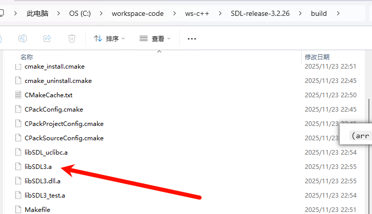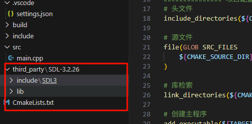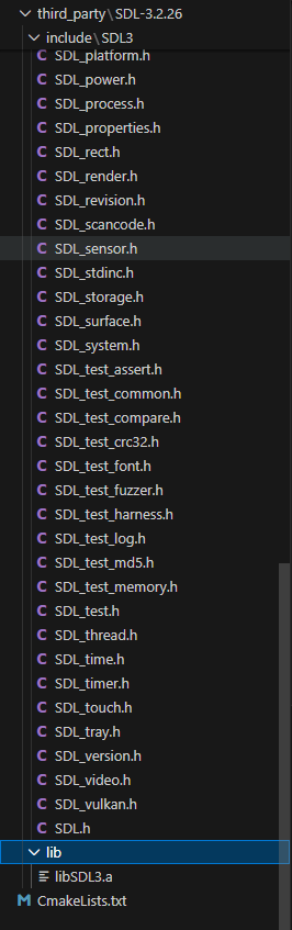 将之前编译的静态库文件复制到lib目录下,将头文件复制到include\SDL3目录下, 这里要注意,为保持sdl原来的引用关系,需要将头文件放在三方库sdl目录下的include\SDL3下。