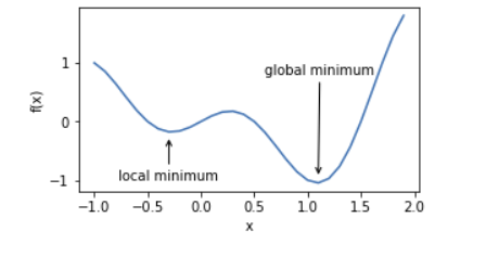对于目标函数 f ( x ) f(x) f(x),如果 f ( x ) f(x) f(x) 在 x x x 上的值比在 x x x 邻近的其他点的值更小,那么 f ( x ) f(x) f(x) 可能是一个局部最小值(local minimum)。如果 f ( x ) f(x) f(x) 在 x x x 上的值是目标函数在整个定义域上的最小值,那么 f ( x ) f(x) f(x) 是全局最小值(global minimum)。