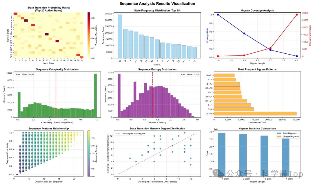 状态惯性原则:状态转移矩阵中自转移概率占主导(对角线高亮),2-gram统计显示"motif自循环"最常见,表明时间动态具有持续性。