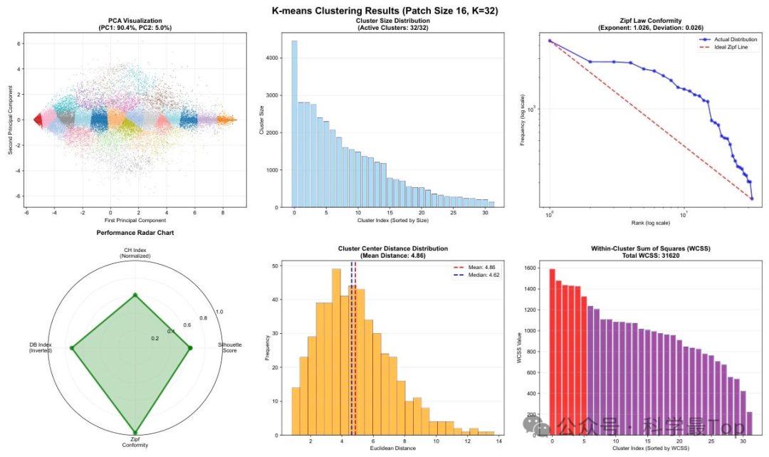 Zipf定律验证:簇大小分布呈典型长尾结构,log-log坐标下与理想Zipf分布偏差仅0.026,证明时间序列token遵循类语言的幂律分布。