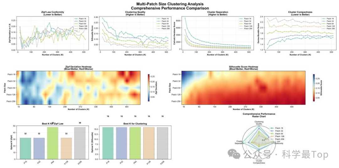 小patch(P=16):聚类质量高(轮廓系数高),对应简单"原子"模式,结构清晰但语义单一。