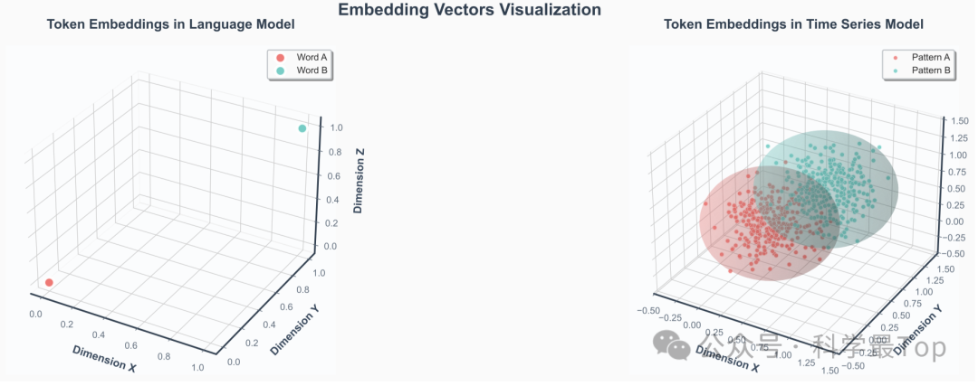 图2:语言token与时序patch嵌入的对比。左图:在语言模型中,token嵌入呈现为离散且稀疏分布的单点。右图:在时间序列模型中,patch嵌入形成具有有限厚度的概率云;同一 motifs(模式A/B)的patch聚集成可分离但内部连续的区域,阐释了"分布性token"的概念。