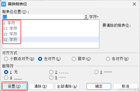 在输入完一个制表位后,点击一次【设置】,即添加到下面的列表中。