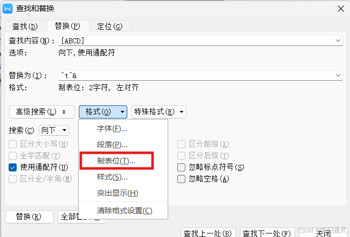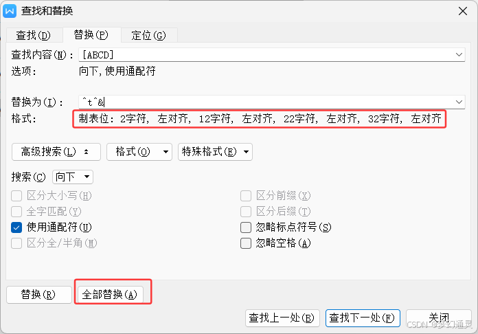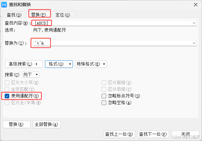 查找替换的快捷键【Ctrl+H】,在弹出来的窗口,切换到【替换】页签,在查找内容输入【[ABCD]】,在替换为处输入【^ t ^&】,并勾选【使用通配符】,操作如下所示。