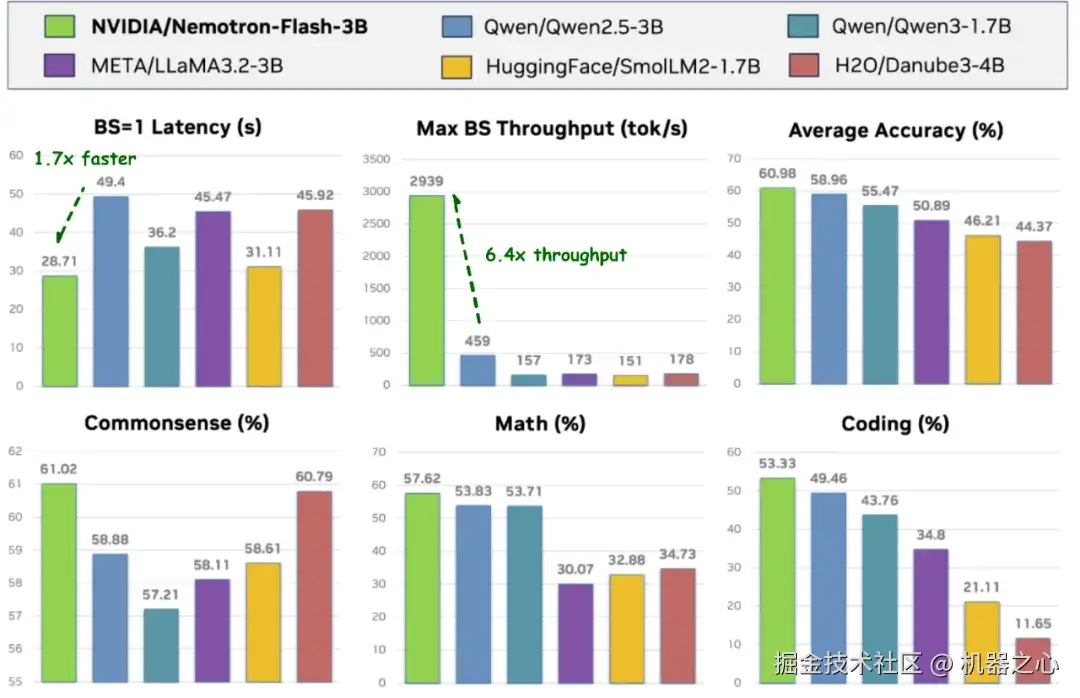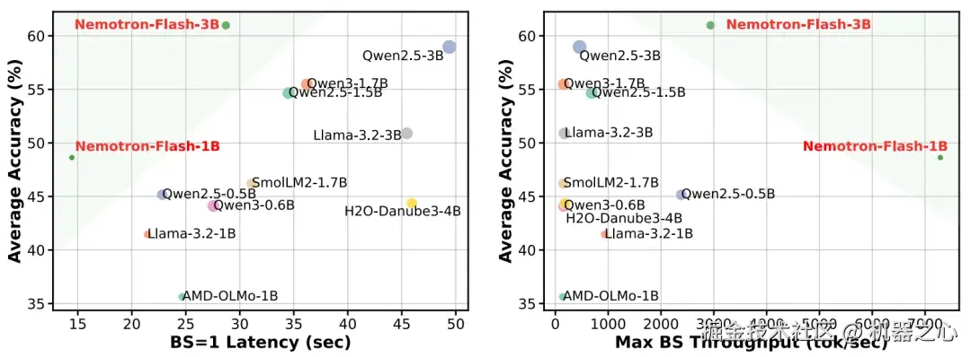 Nemotron-Flash-1B 相比 Qwen3-0.6B,准确率提升 5.5%,端侧推理延迟(batch size=1)快 1.9×,最大吞吐高出 45.6×;