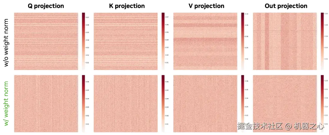 英伟达观察到,小模型训练后期权重矩阵内部会逐渐形成 structured outliers:随着训练推进,部分行或列会系统性地放大,出现远高于整体分布的大幅值结构,成为随着优化过程累积产生的 "结构化巨权重"。问题在于:这些巨权重会拖慢乃至冻结训练后期的进展。 当某些方向的权重范数过大时,反向传播的梯度在这些方向上被不断缩放,导致 effective learning rate 急剧下降。模型看似还在更新,但实际已经 "踩不动油门",无法继续提升。
