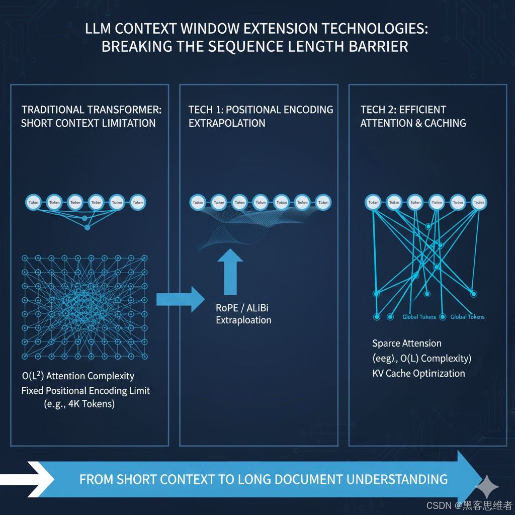 大型语言模型(LLMs)的能力在很大程度上受限于其能够同时处理的上下文窗口(Context Window)长度。传统的 Transformer 模型通常只能处理 4K 到 8K 的 Token 序列,这使其在处理长篇文档、法律合同或完整技术报告时显得力不从心。近年来,研究者通过引入位置编码外推、稀疏注意力、以及KV缓存压缩等一系列上下文窗口扩展技术,成功将 LLMs 的处理长度推至数万甚至十万 Token 级别。本文将深入解析这些技术背后的原理,阐述它们如何帮助模型理解复杂长文本,并探讨其在专业领域中的关键应用价值。