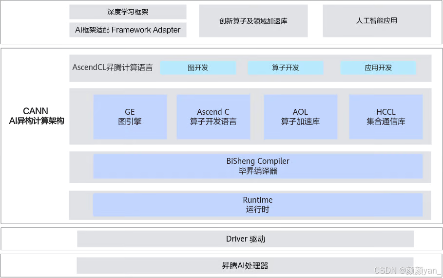 CANN采用了清晰的分层架构设计,每一层都承担着特定的功能职责,共同构建起完整的异构计算体系。