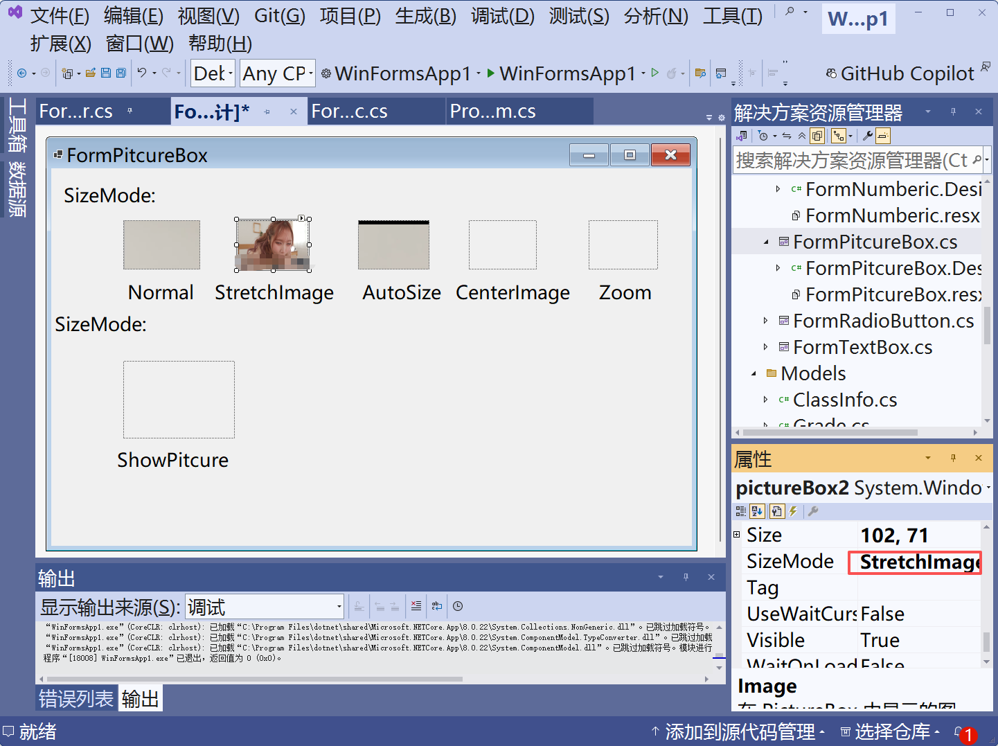 pictureBoxShow.SizeMode = PictureBoxSizeMode.StretchImage;//拉伸