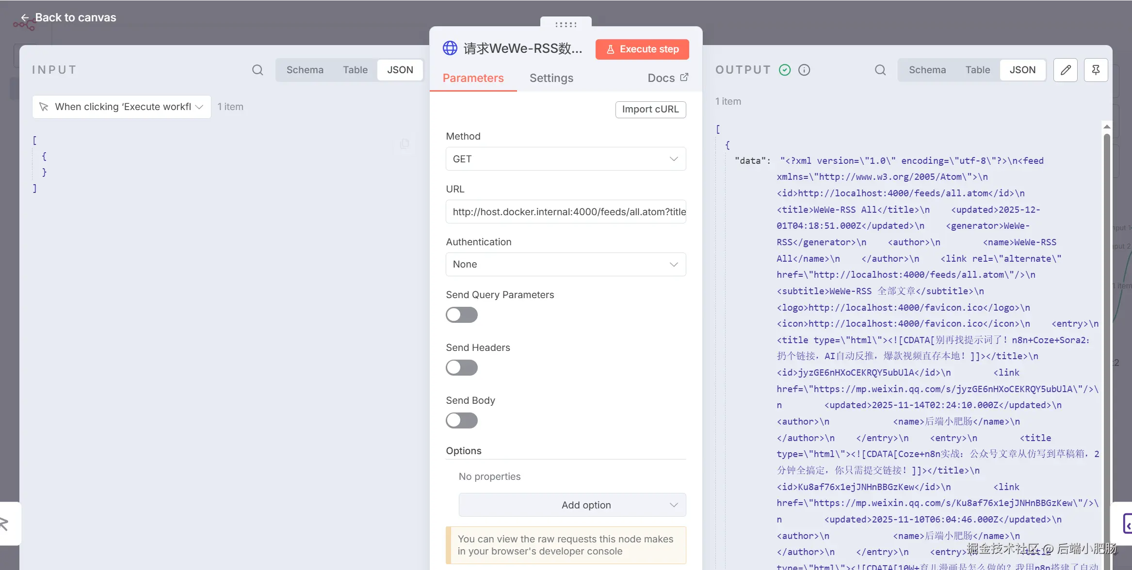 - URL填写host.docker.internal:4000/feeds/all.a... 意为只获取标题涵盖n8n的文章数据。
