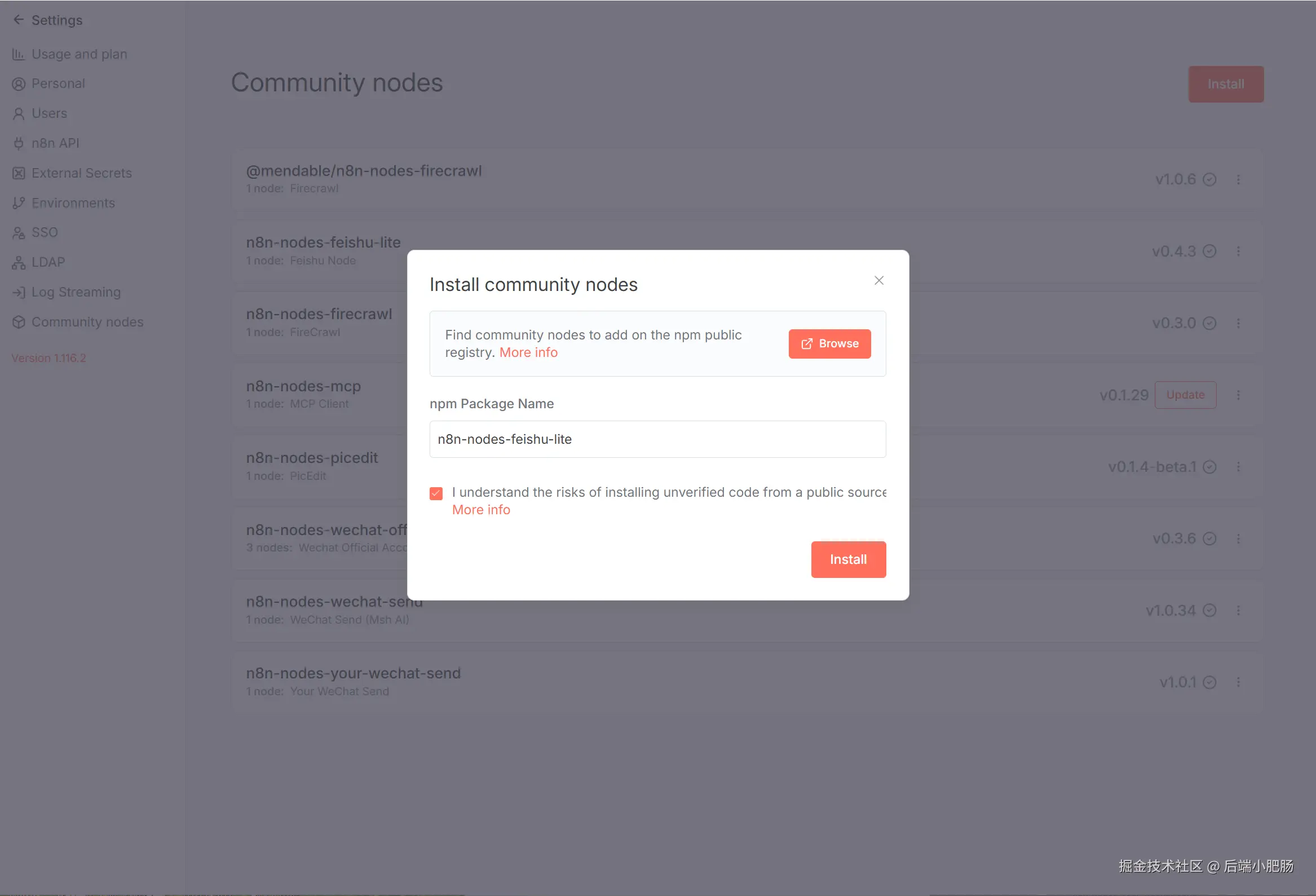 在本文n8n工作流中我们需要用到飞书社区节点,需要自行安装一下。来到Community nodes 界面,点击【Install】按钮在npm Package Name 处输出n8n-nodes-feishu-lite,勾线底部协议再点击【Install】按钮即可。