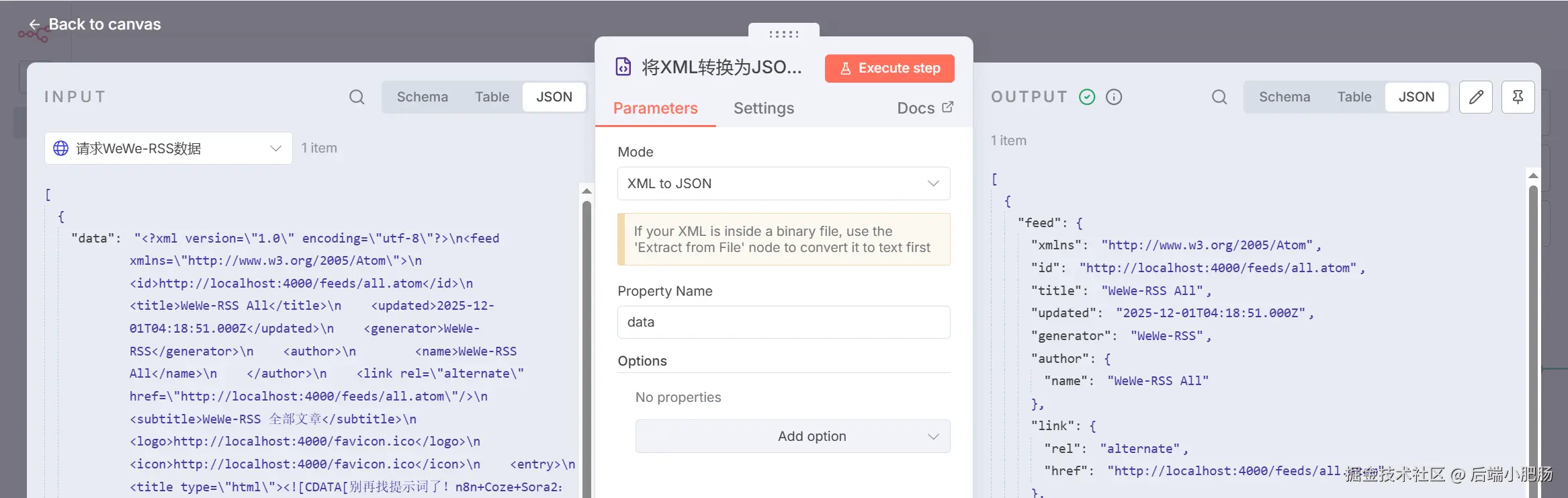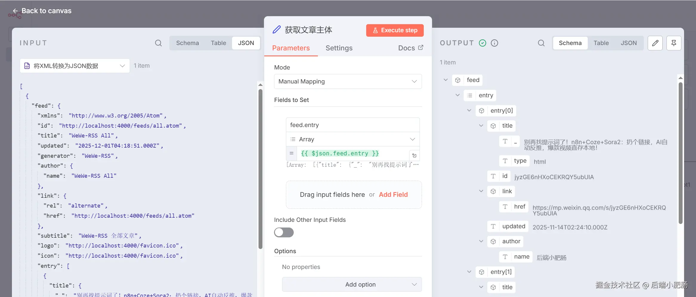 Edit Fields(获取文章主体):XML(将XML转换为 JSON 数据) 节点出来后点击【+】新增Edit Fields节点。这个节点的作用是取出文章主体数据,包含作者名称、标题、文章链接、发布时间。