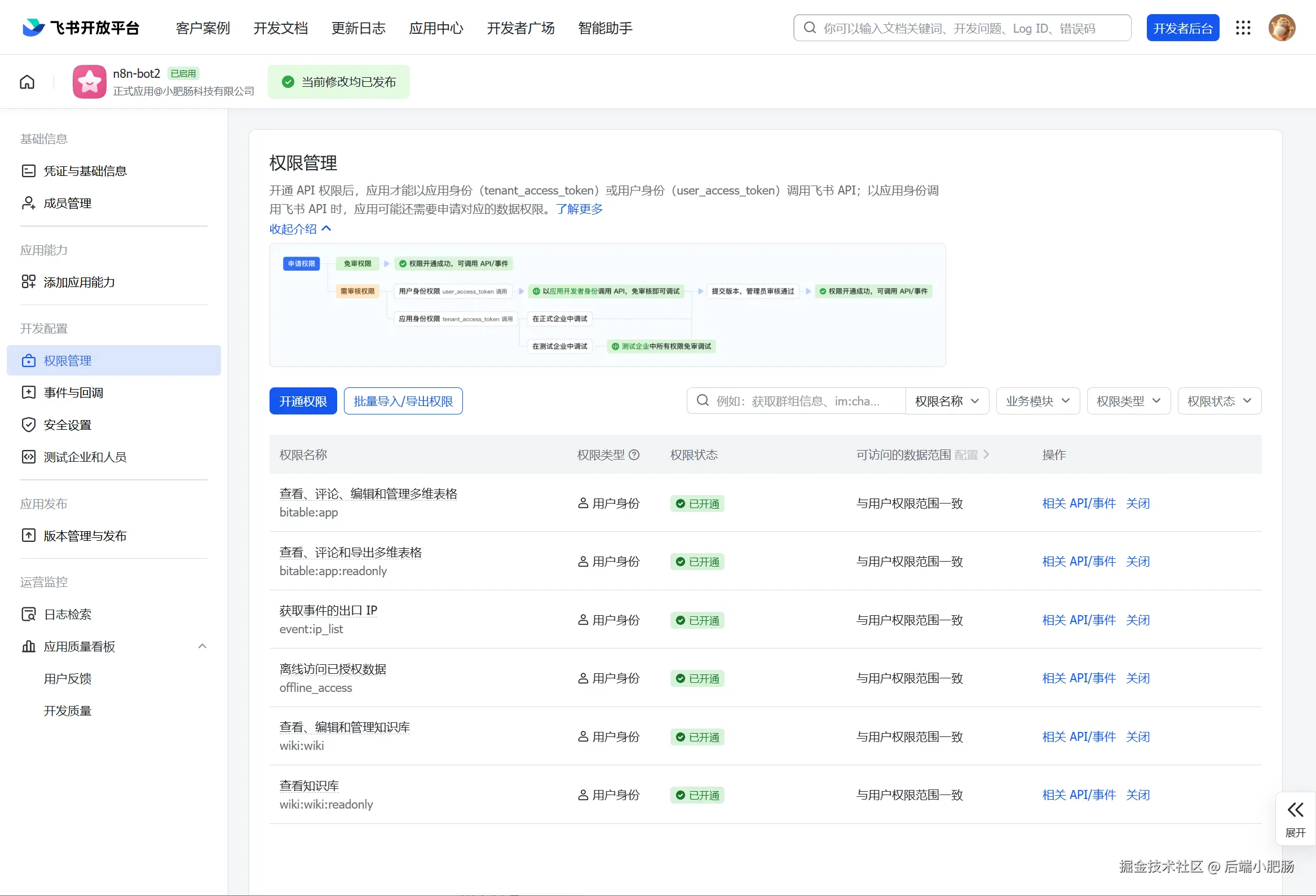 - 把飞书凭证中的Scop权限在飞书应用的【权限管理】页面中一一开通。