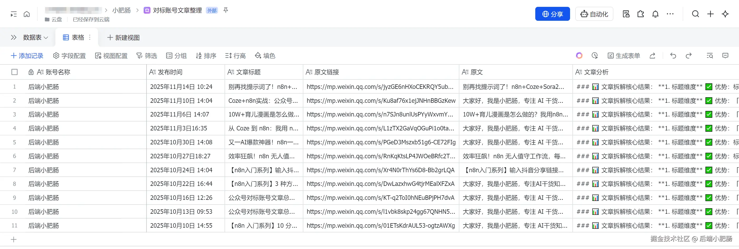 等待几分钟,对标账号文章的内容就被写入到了飞书表格当中。