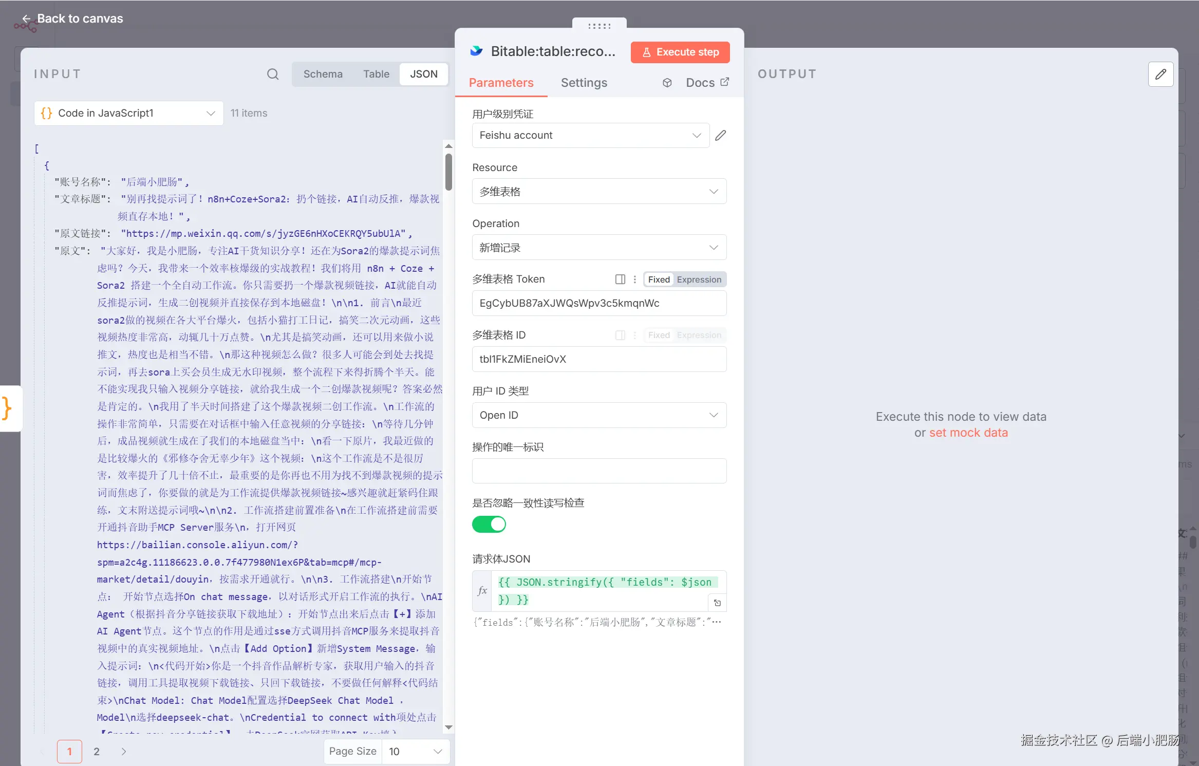 想象一下这个画面: 当你还在睡觉时,你的 n8n 机器人已经帮你把对标账号最新发布的文章抓取下来,丢给 Coze 进行智能拆解(提取标题、金句、写作逻辑),最后整整齐齐地填入你的飞书表格中。早上醒来,你面对的不再是杂乱的信息流,而是一份处理好的写作灵感库,话不多说直接演示!