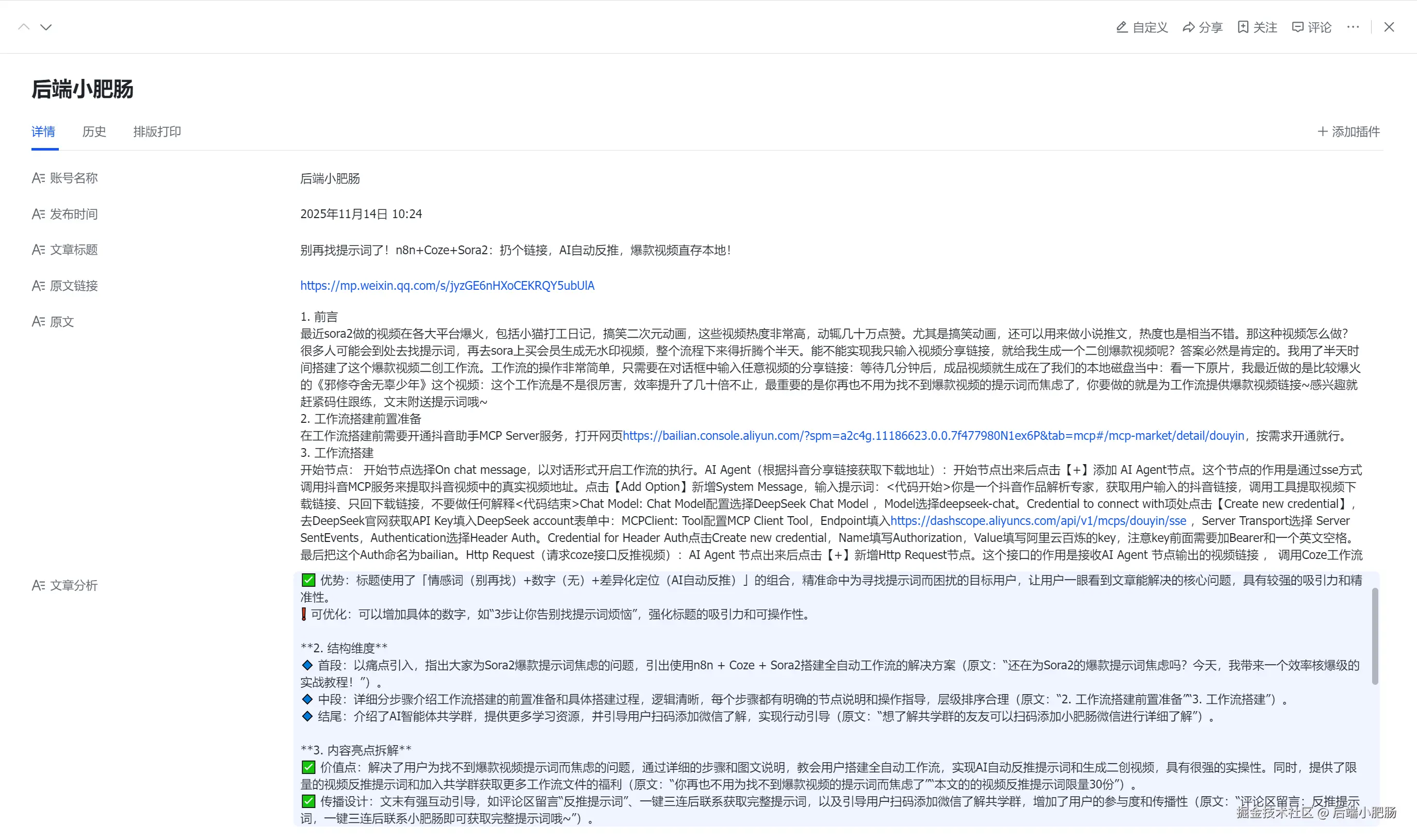 点击查看任意一条记录的详情可以看到详情,只要将这个 工作流 改为定时运行,就能实现文章的自动读取以及录入到 飞书 当中。