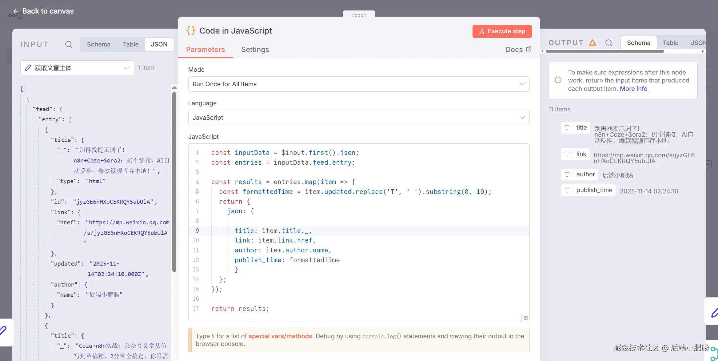 Code in JavaScript (封装对象):Edit Fields(获取文章主体) 节点出来后点击【+】新增Code in JavaScript节点。这个节点的作用是取出作者名称、标题、文章链接、发布时间这些属性组装成新的对象。