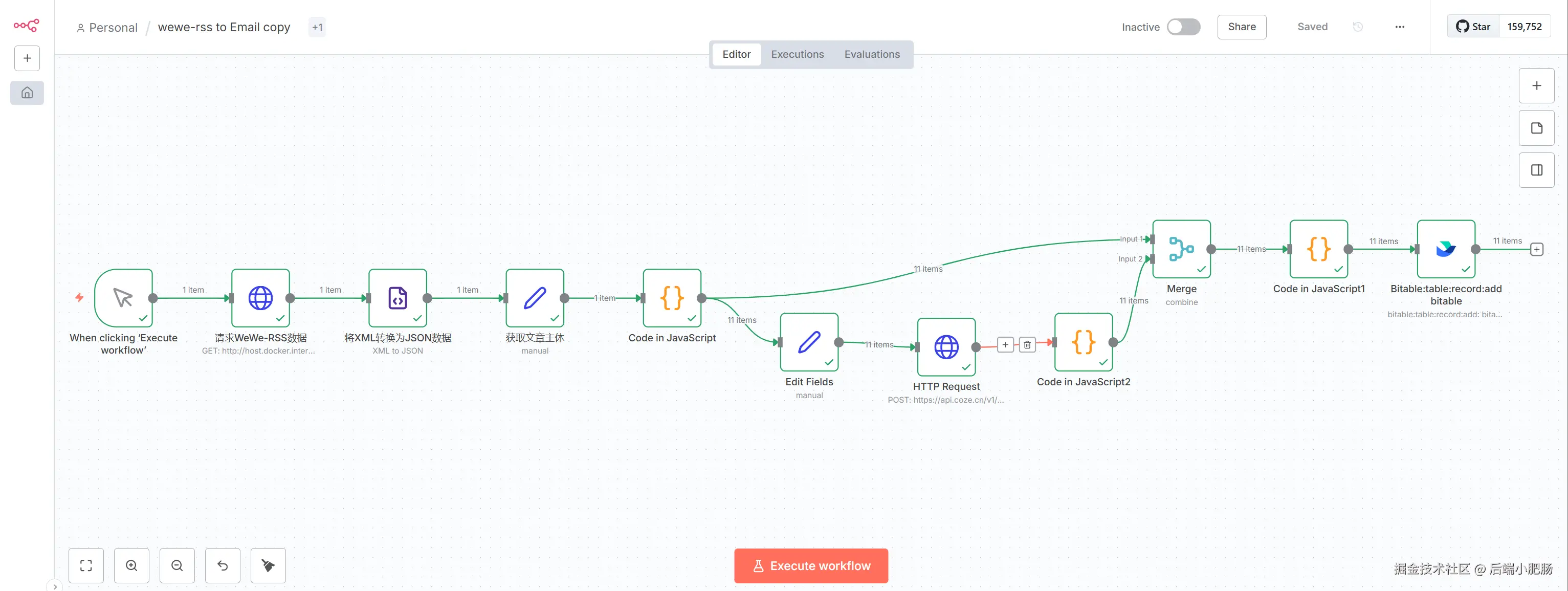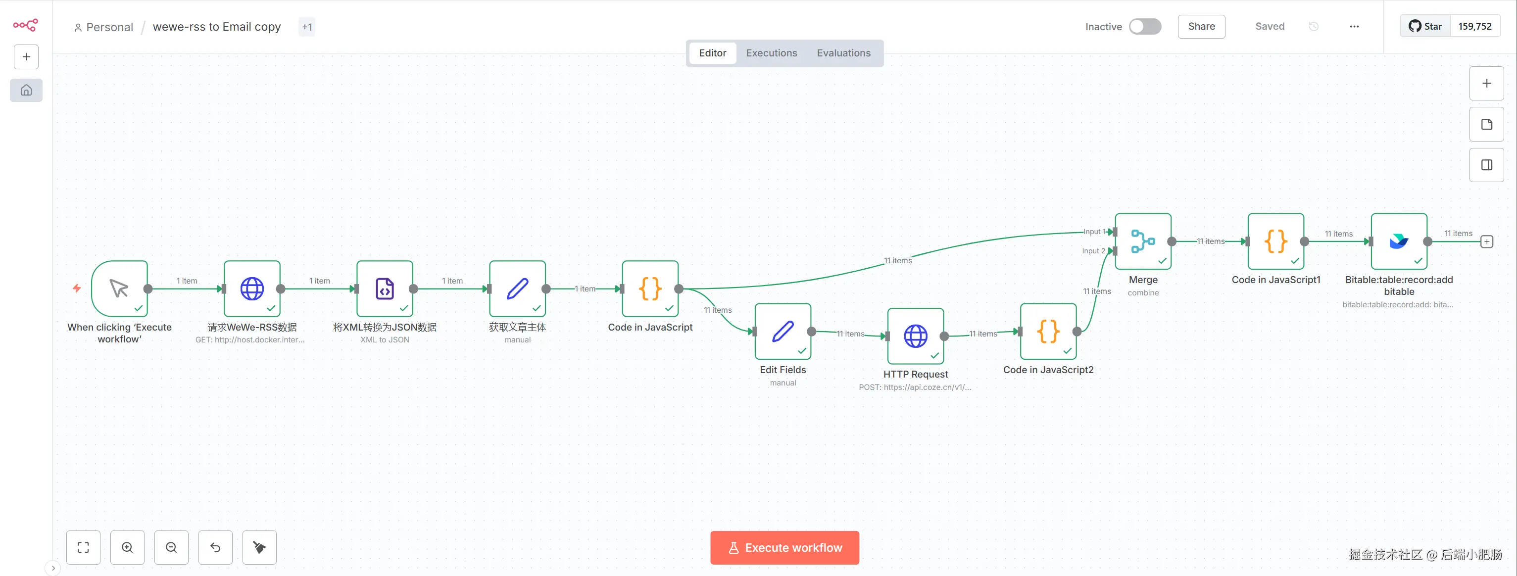 工作流的使用只点击底部的【Excute workflow】按钮。