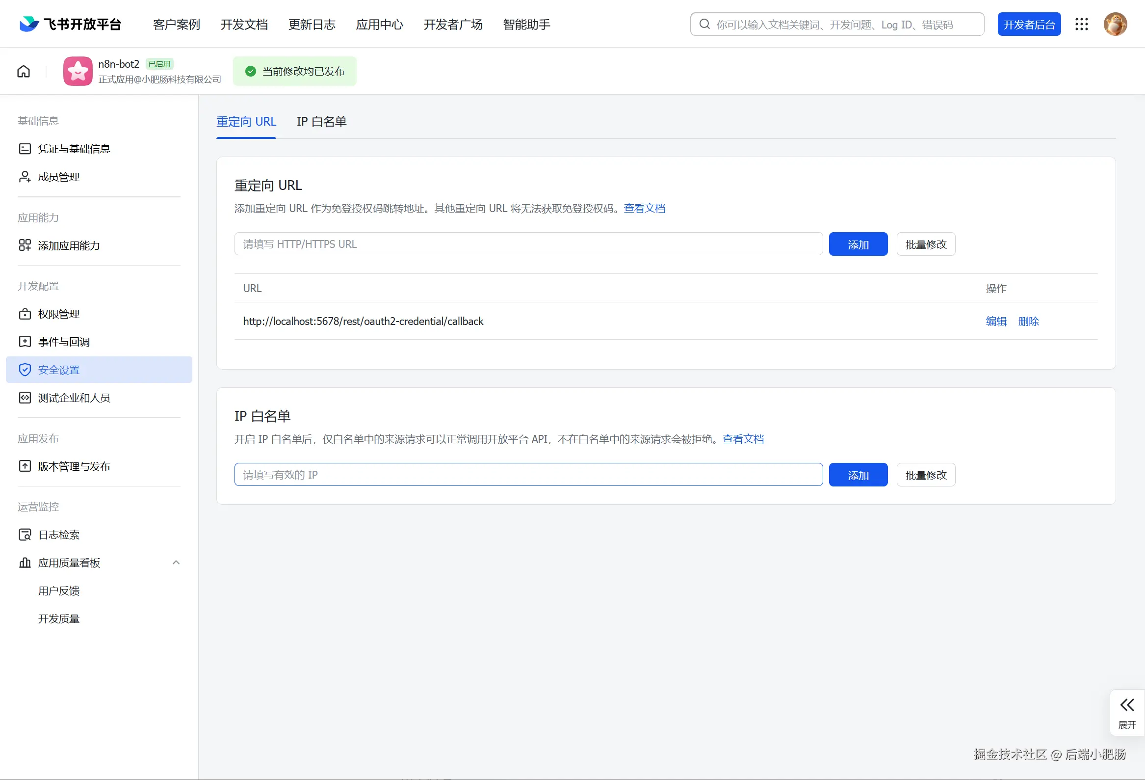 - 选中飞书凭证中的OAuth Redirect URL地址,粘贴到飞书应用界面【安全设置】页面中的重定向 URL里。