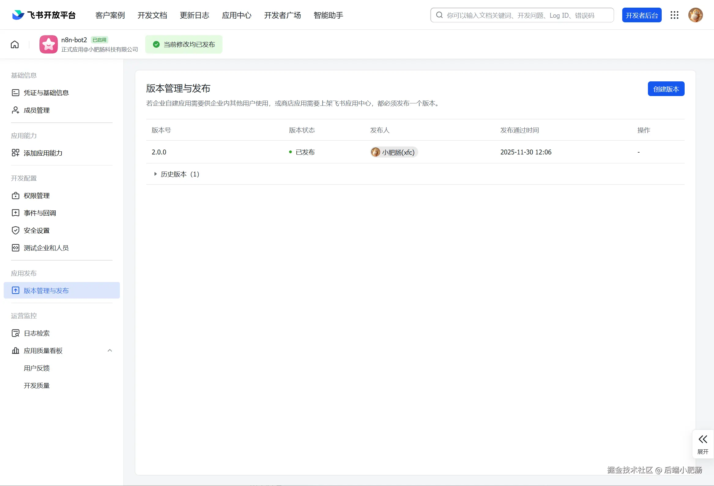 跳转至【版本管理与发布】进行应用发布,审核通过后就能在n8n中进行飞书多维表格相的关操作了。