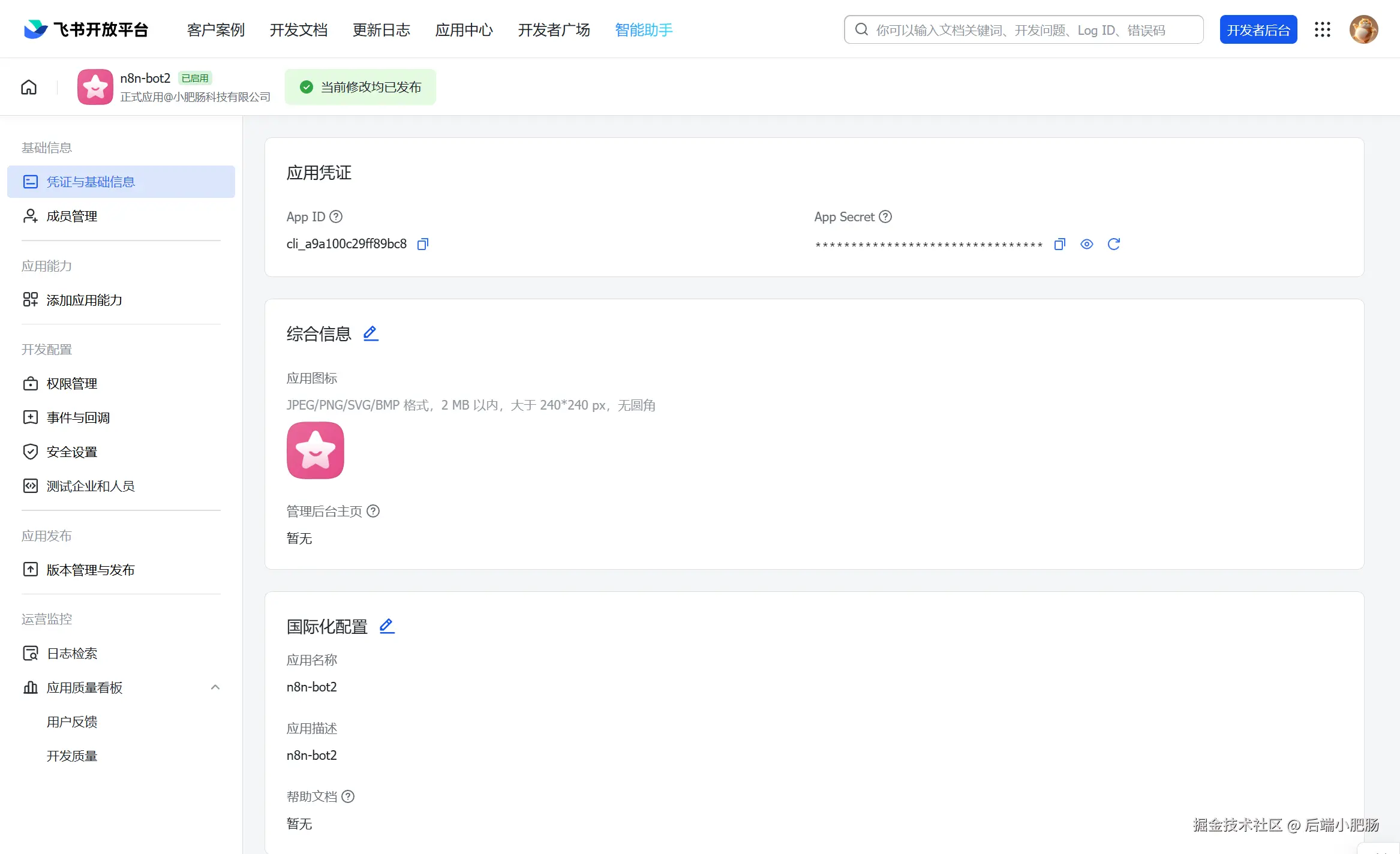 - 创建一个企业自建应用,进入应用后将App ID粘贴到飞书凭证中的Client ID,将App Secret粘贴到飞书凭证中的Client Secret。