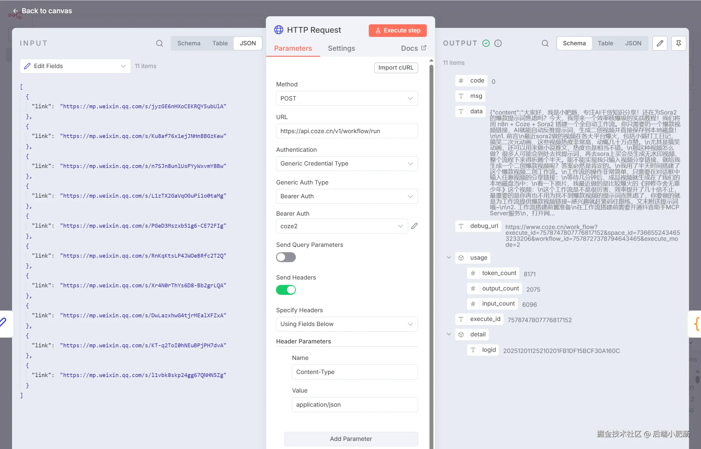 HTTP Request(调用Coze 工作流 提取和解析文章):Edit Fields(取出文章链接) 节点出来后点击【+】HTTP Request节点,这个节点的作用是调用Coze工作流的API提取和解析文章内容。