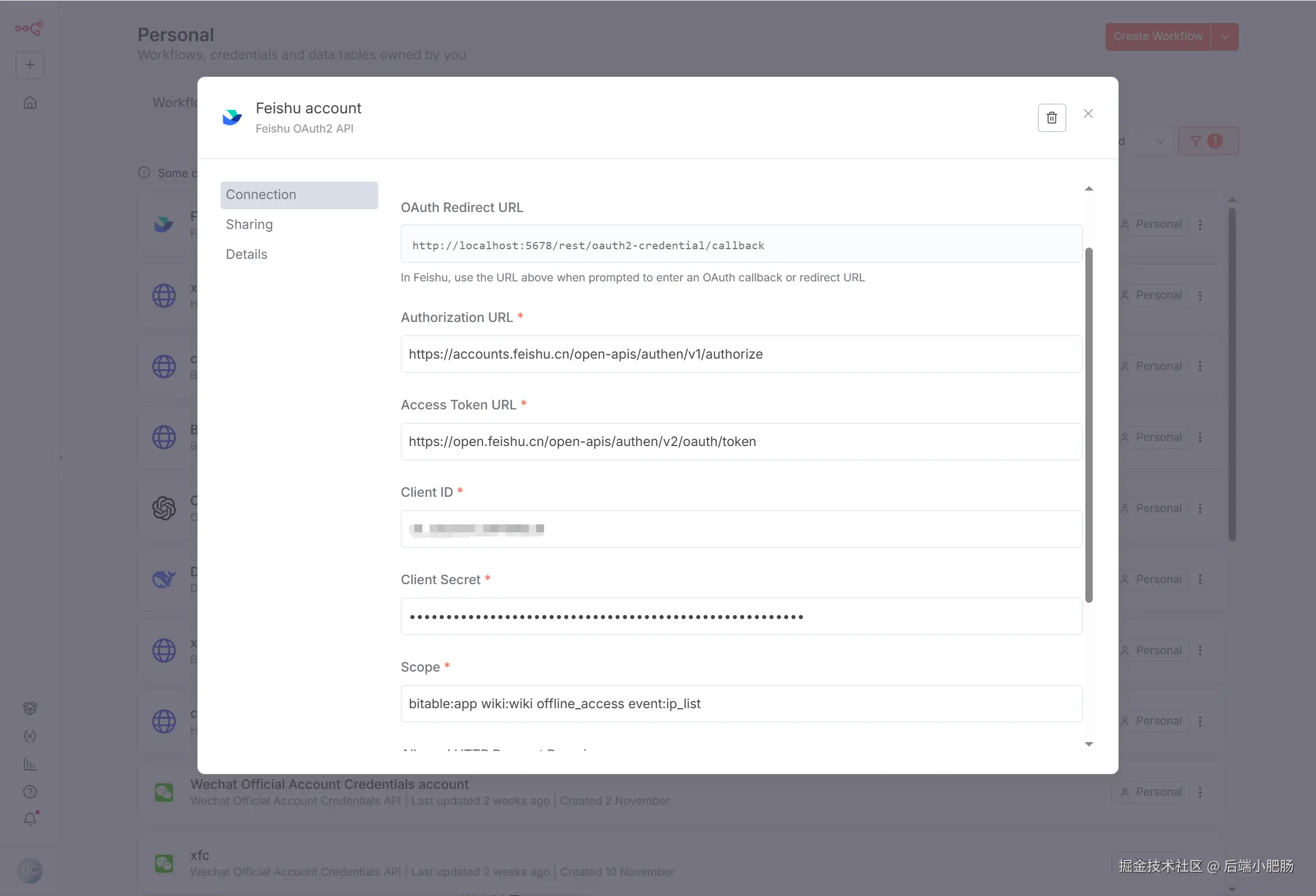 安装完成后需要创建飞书凭证,回到n8n主页点击【Create Credential】新增飞书凭证。